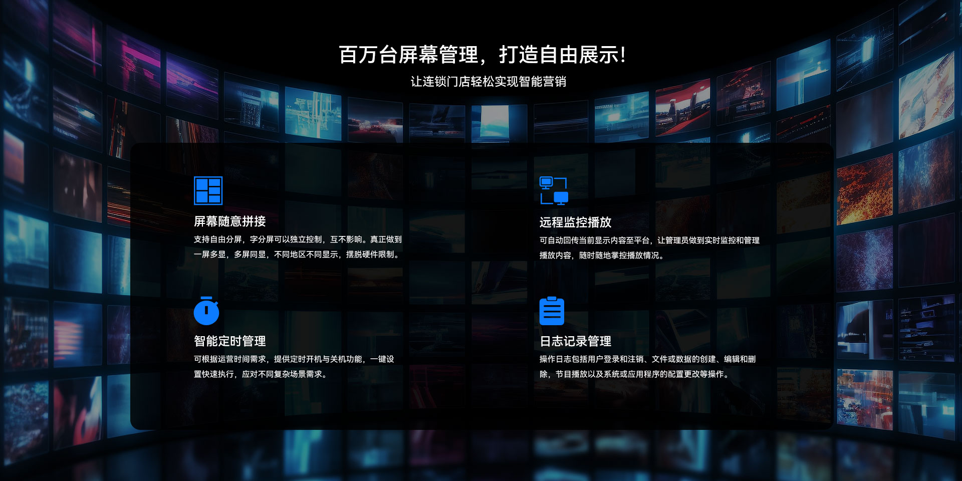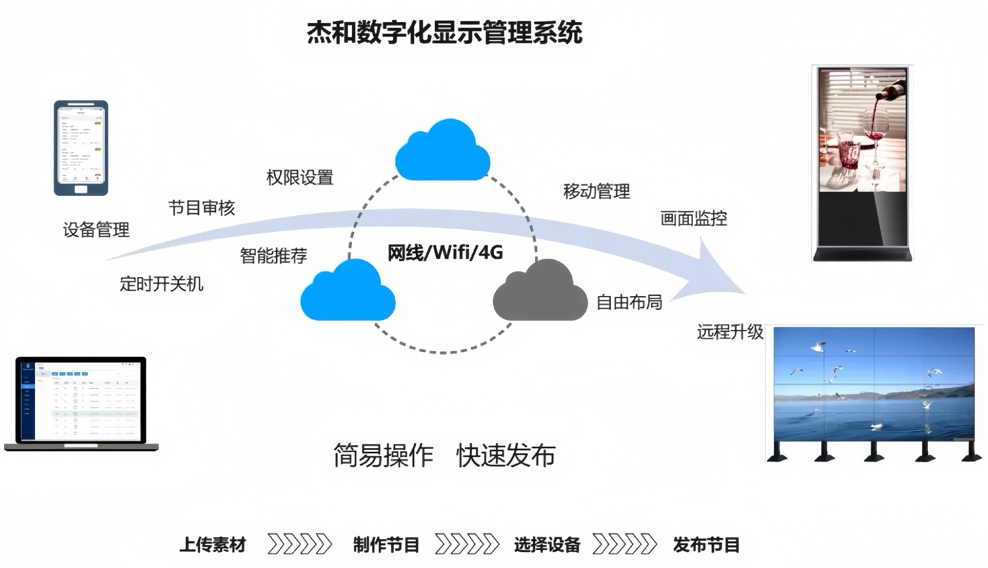 目前南宫NG·28(中国)相信品牌力量科技GDSM-ES系统覆盖市场上多形态网络智能显示终端,满足行业全产品业态需求,如广告机、LED显示屏、LCD拼接屏 、普通液晶电视等各种显示终端,广泛用于广告宣传、通知公告、指示引导。
